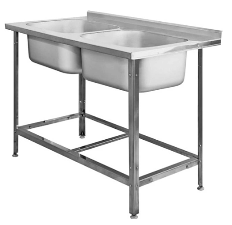 Ванна моечная сварная двухсекционная с бортом и полкой под смеситель. Ёмкости ванны выполнена из нержавеющей стали марки AISI304. Углы ванн заварены и зашлифованы. Каркас ванны может быть выполнен из крашенной/оцинкованной/нержавеющей стали. Стойки каркаса — уголок. Все кромки ванны имеют подгиб, что полностью исключает получение травмы персоналом при сборке, эксплуатации и санитарной обработке ванны. Опорные ножки регулируются по высоте.